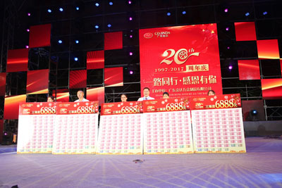 當(dāng)天晚會(huì),為弘揚(yáng)慈善精神,感謝各位服務(wù)中心老板、供應(yīng)商朋友們對(duì)金達(dá)公司二十周年慶典活動(dòng)的大力贊助,經(jīng)金達(dá)公司董事會(huì)的決定,將本次活動(dòng)所籌集的全部贊助金(135萬(wàn)元),另廣東金達(dá)公司贊助金100萬(wàn)元,合計(jì)235萬(wàn)元全部將用于成立“廣東金達(dá)慈善事業(yè)基金會(huì)”。此外,廣東金達(dá)公司還決定每年捐贈(zèng)500000元廣東金達(dá)慈善事業(yè)基金會(huì),主要用于幫扶公司有困難的服務(wù)中心客戶、供應(yīng)商、公司內(nèi)部困難職工。
