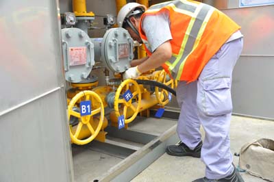 20分鐘后,然氣搶險隊及時趕到現場,立即進行一系列搶修工作。拉起警戒線,架起吹風機,穿戴防毒面罩,主要技術人員立即到泄漏點了解泄漏原因。但由于此時,現場天然氣濃度不斷升高,潛在爆炸危險,而且然氣靠近作業(yè)區(qū),機器仍在運行當中。然而搶險人員處變不驚,一邊迅速從然氣總閥進行引流,將泄漏煤氣從安全管道排出,降低車間然氣濃度,在空曠位置燃燒揮發(fā);另一邊則進行泄漏點維修,及時堵塞泄漏點,制止事故發(fā)生。