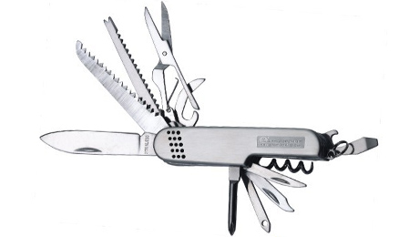 產(chǎn)品參數(shù): 規(guī)格:94X24X17mm 重量:118g 材質(zhì):430不銹鋼+2Cr13不銹鋼 功能:1、開罐器 2、剪刀 3、大刀 4、十字螺絲刀 5、指甲銼(指甲除垢器) 6、螺旋開瓶器
